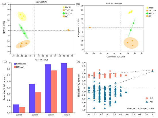 Testing for permutations and multivariate statistical scores among the three japonica rice varieties. (A) PCA, (B) PLS-DA, (C) overview of the PLS-DA model, and (D) PLS-DA permutation testing. PCA, principal component analysis; PC, principal component; PLS-DA, partial least squares discriminant analysis; HY5H, Hongyang 5 hao; YNX28H, Yangnongxiang 28; NJ5718, Nanjing 5718.