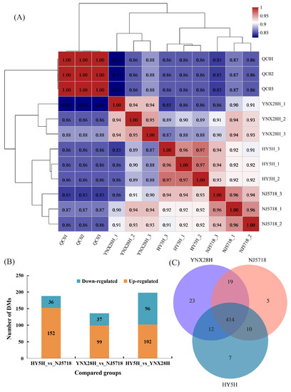 Sample reproducibility and metabolite analysis. (A) Correlation heatmap of three semi-glutinous japonica rice grain samples. The right and inferior sides in the figure are the sample names. (B) Pairwise comparison of DMs. (C) Venn distribution of metabolites. HY5H, Hongyang 5 hao; YNX28H, Yangnongxiang 28; NJ5718, Nanjing 5718.