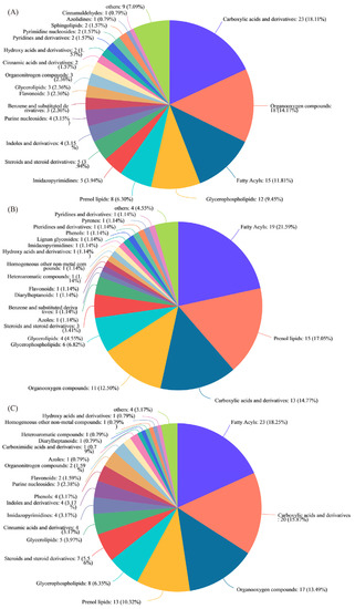 A total of 188 DMs were identified between HY5H and NJ5718 (152 upregulated and 36 downregulated) (Figure 2B; Table S2). Glycerophospholipids accounted for 9.45% of the detected DMs. Prenol lipids formed 6.30% of the total DMs. Flavonoids comprised 2.36% of the total DMs. Glycerolipids accounted for 2.36%, phenols represented 0.79%, and coumarins and their derivatives accounted for 0.79% of the DMs (Figure 3A). A total of 136 DMs were identified between YNX28H and NJ5718 (99 upregulated and 37 downregulated) (Figure 2B; Table S3). Prenol lipids accounted for 17.05% of the detected DMs. Glycerophospholipids accounted for 6.82%, glycerolipids accounted for 4.55%, lignan glycosides accounted for 1.14%, phenols accounted for 1.14%, and flavonoids accounted for 1.14% of DMs (Figure 3B). A total of 198 DMs were identified between HY5H and YNX28H (102 upregulated and 96 downregulated) (Figure 2B; Table S4). Prenol lipids accounted for 10.32% of the detected DMs. Glycerophospholipids represented 6.35%, glycerolipids accounted for 3.97%, cinnamic acids and their derivatives accounted for 3.17%, phenols accounted for 3.17%, flavonoids accounted for 1.59%, and lignan glycosides comprised 0.79% of the DMs (Figure 3C). The three varieties had 414 common metabolites, and each variety also had its own unique metabolites (Figure 2C). In addition, we visualized the metabolites of each comparison group in a volcano map (Figure S1A–C).