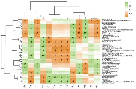 Correlation analysis of rice quality traits and DMs. * p < 0.05, ** p < 0.01, and *** p < 0.001. BR, brown rice rate; MR, milled rice rate; HMR, head milled rice rate; CR, chalkiness rate; CD, chalkiness degree; GC, gel consistency; PC, protein content; AC, amylose content; AP, appearance; HA, hardness; VI, viscosity; BD, balance degree; TV, taste value.
