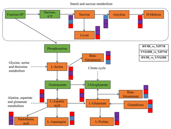 Plant metabolism often forms complex pathways and networks through different molecules, which eventually leads to systematic changes in metabonomics. Through the use of the KEGG pathway database (http://www.kegg.jp/kegg/pathway.html, accessed on 1 July 2022), we found that the DMs identified between the HY5H and NJ5718 varieties were involved in flavone and flavonol biosynthesis; pentose and glucuronate interconversion; fatty acid biosynthesis; glucosinolate biosynthesis; glycerolipid metabolism, starch and sucrose metabolism; and alpha-linolenic acid metabolism (Table S5). The DMs identified between the YNX28H and NJ5718 varieties participate in linoleic acid metabolism, the pentose phosphate pathway, glycerolipid metabolism, alpha-linolenic acid metabolism, glyoxylate and dicarboxylate metabolism, pentose and glucuronate interconversion, and starch and sucrose metabolism (Table S5). The DMs identified between the HY5H and YNX28H varieties participate in pantothenate and CoA biosynthesis, the pentose phosphate pathway, phenylpropanoid biosynthesis, pentose and glucuronate interconversions, glycerolipid metabolism, alpha-linolenic acid metabolism, starch and sucrose metabolism, and glycerophospholipid metabolism (Table S5).