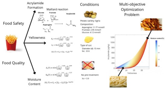 This paper addresses the problem of food safety combined with product quality. It uses a multi-objective approach, which has been widely used in the literature [6,7,8,9,10,11,12,13,14,15]. Other studies such as that of Mestdagh [55] have studied balances between acrylamide and color but not from the quantitative and multi-objective optimization point of view addressed in this paper.