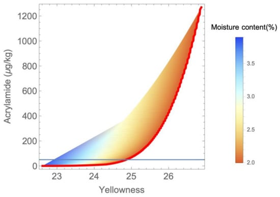 The first relationship was, as expected, that the higher the yellowness, the lower the moisture content and the higher the amount of acrylamide. All of this was positively correlated with the treatment severity (i.e., higher temperatures and/or treatment times led to an increase in the above-mentioned variables). On the other hand, given the problem boundaries and constraints, the yellowness was limited to values between 22 and 27, while the acrylamide did not exceed 1300 µg/kg which is 26 times higher than the EFSA recommendation.