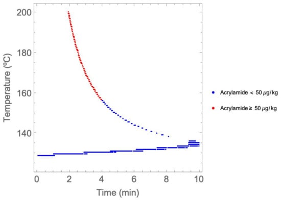 A temperature–time representation of the Pareto front is shown in Figure 3. The points in red represent operational points that do not comply with the EFSA recommendation in terms of acrylamide amount, and they correspond to the highest temperatures. It can be seen that from approximately 155 °C, the dots form a curve that tends to be vertically asymptotic. This curve coincides with the conditions that keep the moisture content constraint active with a value of 2%.