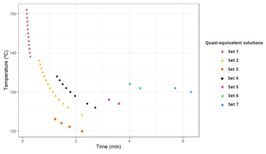 Table 1 and Figure 4 show that the lower the time and temperature, the higher number of equivalent solutions. As time or temperature increases, the number of equivalent solutions decreases and the curve defined by them becomes more horizontal (i.e., temperature differences are relatively lower than the difference in processing time in these cases). It is of note that, mathematically speaking, no equivalent solutions for the Pareto front can be found in this problem but, due to the flatness of the objective functions in certain temperature–time ranges, a set of very similar (called equivalent here) solutions can be found, allowing processes to be flexible to achieve certain results. No equivalent solutions according to the definition above were found for temperature-time conditions where acrylamide values were above 9 μg/kg.