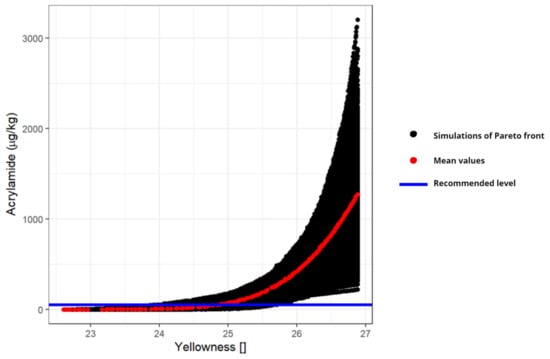 Figure 5 shows, on the vertical axis, the amount of acrylamide produced and on the horizontal axis, the yellowness. The black dots are the Pareto fronts of the 1000 simulations where the red line represents the Pareto front with the mean values of the Maillard’s kinetic parameters (shown in Figure 2) and the blue line represents the quantity of recommended acrylamide. The Pareto front resulting from the average kinetic values is located approximately in the middle zone of the solutions, so the assumed normal distributions for the kinetic parameters translate into a symmetric distribution of the Pareto solutions for each yellowness value. On the other hand, the uncertainty increases as the yellowness (i.e., temperature and/or time) increases. The combination of these two means that around 95% of the points considering all the 1000 Pareto fronts are outside the recommendation in terms of acrylamide production.