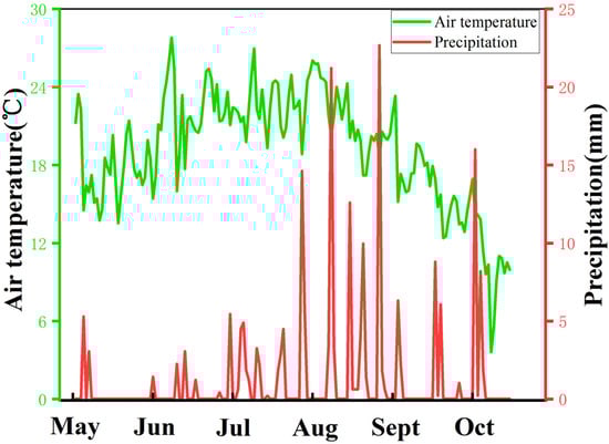 The field experiment was carried out from May 2021 to October 2021 on a Small Miscellaneous Grain Test Base (38°22′ N, 109°44′ E, 1229 m above sea level) at the Academy of Agricultural Sciences, Yulin City, Shaanxi Province. This region has a temperate and semi-arid monsoon climate. The meteorological data during the sorghum growing season are shown in Figure 1, with an annual average temperature of 10.4 °C and annual average precipitation of 400 mm. Precipitation mainly occurs in August and September. The region has sandy loam soil. The previous crops were uniformly fertilized after harvesting. Base fertilizer: 2 cubic meters of cow dung; Seed fertilizer: 10 kg of diammonium hydrogen phosphate and 10 kg of potassium sulfate applied simultaneously. Urea (containing 46%) top dressing was applied at the jointing stage.