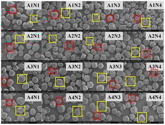 The effect of different nitrogen fertilizer treatments on the morphology of sorghum starch granules is shown in Figure 2. The four sorghum varieties are Liaoza 10 (A1), Liaoza 19 (A2), Jinza 31 (A3) and Jinza 34 (A4).The appearance and morphology of starch in mature sorghum grain under different nitrogen fertilizer treatments were analyzed using SEM. Two types of sorghum starch granules were identified, a few of which were small spherical granules (red box), but the majority were large and irregular polygonal granules (yellow box), which is consistent with previous findings by Jane et al. who analyzed the starch morphology of 54 grains, including Sorghum grain [17].
