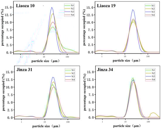 The sorghum size under different nitrogen fertilizer levels is shown in Figure 3 and Table 1. Nitrogen fertilizer level had a significant effect on the size of sorghum starch. The distributions of starch particle size of the four sorghum varieties Liaoza 10, Liaoza 19, Jinza 31, and Jinza 34 under different nitrogen fertilizer levels showed a unimodal curve, and when the particle size is 22 μm, the proportion value is the highest. Generally, a high nitrogen fertilizer level increases the size of the starch granules. The highest effect was observed at N3, which is consistent with the findings of Gao et al. on tartary buckwheat [10].