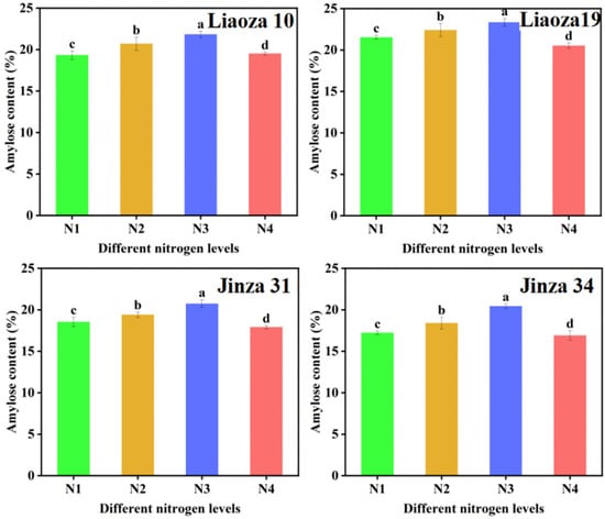 Effects of different nitrogen levels on the amylose content in sorghum grain. Note: values with letters in the figure mean a significant difference (p < 0.05).