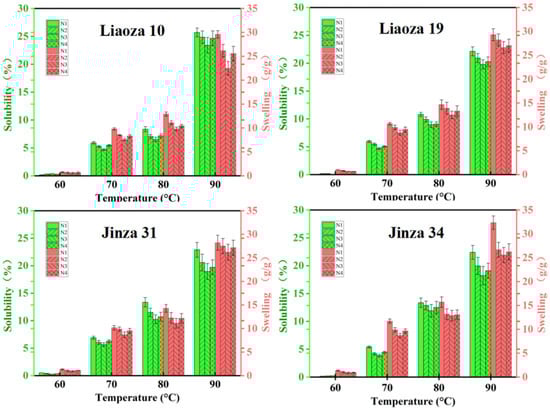 The effects of different nitrogen fertilizer treatments on the solubility and swelling of sorghum starch are shown in Figure 5. The solubility and swelling degree of starch reflect the interaction between starch and water molecules. We found that the solubility and swelling of starch increased rapidly with an increase in the temperature and were highest at 90 °C. The solubility and swelling degree of the same variety gradually decreased with the increase in nitrogen fertilizer level, and the minimum was at N3; that is, the interaction between starch and water molecules was the least. Increasing the application rate of nitrogen fertilizer in the jointing stage will increase the solubility and swelling degree. Nitrogen fertilizer significantly affects the solubility and swelling degree of sorghum starch.