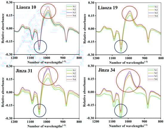 The Fourier transform infrared spectra of sorghum starch under different nitrogen fertilizer treatments are shown in Figure 7, and the peak height ratios R1 and R2 are shown in Table 2. Infrared spectroscopy reflects the short-range ordered structure of starch granules, and the near-infrared spectrum in the range of 1200–800 cm−1 is sensitive to the short-range ordered structure changes in starch. Therefore, we use ATR-FTIR to determine the short-range ordered structure of sorghum starch granules [19]. Starch contains numerous helical structures, some of which are linked by hydrogen bonds to form a stable crystalline structure, and the rest are dispersed in the amorphous region of the starch molecule. The short-range order structure of starch refers to the double-helix structure of starch. Studies have shown that the 1045/1022 cm−1 ratio (R1) is related to the short-range order degree of starch, and the 1022/995 cm−1 ratio (R2) can be used to quantify the ratio of shaped to ordered structures [20]. The highest and lowest and absorption peak of the sorghum starch (Liaoza 10, Liaoza 19, Jinza 31, and Jinza 34) was observed at 1045 cm−1 (blue circle) and 995 cm−1 (red circle). However, with the increase in nitrogen application level, the position and trend of absorption peak of infrared spectra did not change, which indicated that nitrogen application did not affect the range of the short-range ordered structure of sorghum starch.
