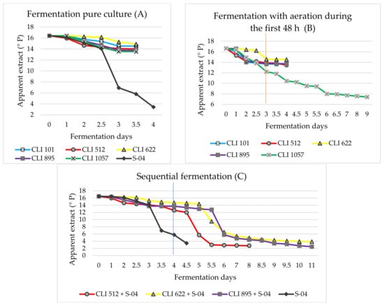 Regarding experiment C, sequential fermentation, the non-Saccharomyces strains were fermented under pure culture conditions during the first four days, at which time the Saccharomyces yeast S-04 was added. Combinations of non-conventional yeast species and S. cerevisiae mostly showed similar slow fermentation progress (10–11 days of fermentation) for strains CLI 622 and CLI 895 (Z. bailii and T. delbrueckii, respectively), in comparison with the H. guilliermondii strain (CLI 512) which showed faster fermentation (7–8 days) (Figure 1). The slower fermentation for strains CLI 622 and CLI 895 could be due to the inhibition of this species by S. cerevisiae after inoculation at 96 h of fermentation. Non-Saccharomyces yeasts can inhibit the growth of S. cerevisiae in co-inoculated or sequential cultures as they can produce toxic compounds such as medium-chain fatty acids and killer factors that can inhibit the growth of Saccharomyces. Also, early nutrient consumption by non-Saccharomyces yeasts during the first days of fermentation can limit the subsequent growth of Saccharomyces yeast, as well as the fermentative capacity, once inoculated sequentially []. The three strains used in sequential fermentation reached fermentation levels similar to those of the control strain (apparent extract 3.43 °P) or even lower, as in the case of strains CLI 512 and CLI 895 (apparent extract 2.75 and 2.49 °P, respectively).