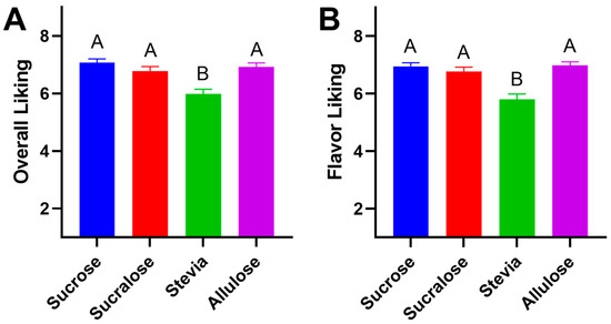 Overall and flavor liking of yogurt samples. 100 participants rated the 4 different yogurt samples on a 9-point hedonic scale for overall liking and flavor liking. The overall liking (A) data showed sucrose (7.07 ± 0.14) ranked highest, followed by allulose (6.93 ± 0.14), sucralose (6.78 ± 0.16) and stevia (5.98 ± 0.17). Compiled data for flavor liking (B) concluded that allulose (6.98 ± 0.13) ranked highest, followed by sucrose (6.95 ± 0.13), sucralose (6.77 ± 0.16) and stevia (5.81 ± 0.13). Bars show mean and SEM, different letters denote statistical differences.