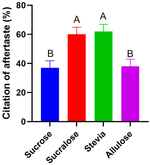 The presence of an aftertaste is often noted in alternative sweeteners and plays a key role in distinguishing their sensory properties from that of sucrose. Alternative sweeteners often have a broad sweetness curve with lingering off-flavors [34]. Here, we found that both sucralose and stevia were cited as having an aftertaste significantly more often than sucrose or allulose (Figure 2). Furthermore, participants noted that the aftertaste associated with sucralose and stevia tasted “artificial”, “chemical-like”, and “bitter” (Supplemental Table S2).