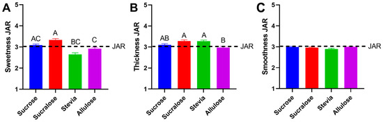 Samples were also rated on JAR scales for thickness and smoothness, as sweeteners like sucrose are known to act as a bulking agent, and thus add more than just sweetness to food products. The JAR data for the thickness showed an average rating of 3.10 ± 0.05 for sucrose, 2.97 ± 0.05 for allulose, 3.27 ± 0.06 for stevia and 3.28 ± 0.06 for sucralose. Interestingly, the allulose sweetened sample was rated as slightly less thick versus stevia or sucralose sweetened samples, despite presumably benefiting from the bulking properties inherently missing from the HPSs. No difference was reported in smoothness between samples (Figure 3B,C), with all samples rated close to JAR.