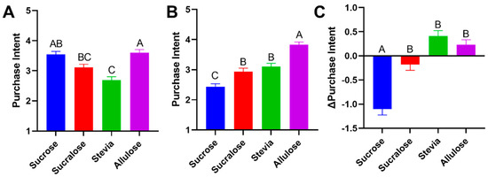 Purchase intent. Purchase intent (5-point scale) for the samples was compiled with data corresponding to before (A) and after (B) providing information about the sweeteners to participants, as well as the difference between before and after, presumably arising from this information (C). In the scoring process, 1 = Definitely would not purchase, 2 = Probably would not purchase, 3 = May or may not purchase, 4 = Probably would purchase, 5 = Definitely would purchase. Bars show mean and SEM, different letters denote statistical differences.