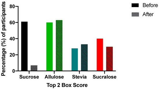 Results were in line with a greater consumer focus on healthfulness and the emergence of many new diets and lifestyles, such as keto and low carb. While stevia did see an increase in purchase intent when information was provided, this increase was not sufficient to distinguish its scores from those of sucralose, confirming that a natural claim may not be effective alone in driving purchase intent [39], and is best when combined with a pleasing sensory profile. Comparing purchase intent before and after disclosure of the potential source of the sweetener confirmed that consumers were willing to purchase products made with upcycled ingredients when the flavor of the product was acceptable while helping to improve the sustainability of our food system [40].