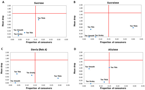 Penalty analysis of sweetened yogurt samples. Penalty analysis showing the attributes negatively impacting the overall liking (mean drop), and proportion of consumers agreeing for yogurt products sweetened with (A) Sucrose, (B) Sucralose, (C) Stevia, (D) Allulose.