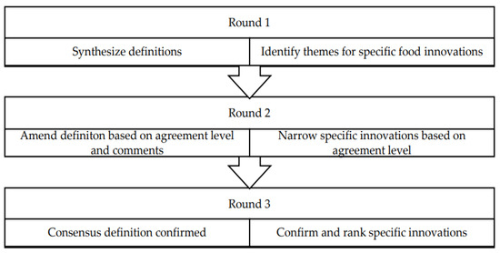 The 13 experts were given two weeks to complete each questionnaire. The participants received reminder emails with one week left to respond and two days left to respond to encourage completion. Thirteen experts (n = 13) responded to round one within two weeks. Through three rounds of questioning, the experts were enabled to reach a consensus on the food innovations definition and identify specific food innovations which are likely to be available to consumers by 2027 (Figure 1). Prior to each round, a trial run was conducted to minimize the risk of technical issues or misinterpretation of agreement statements.