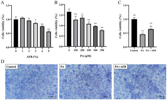 HepG2 cells were cultured in DMEM with 10% fetal bovine serum (FBS) and maintained at 37 °C in a moist atmosphere containing 5% CO2. To investigate the cytotoxicity of PA and AFB, the HepG2 cells were exposed to different concentrations of PA (150, 200, 250, 300, and 350 μM) and AFB (1%, 2%, 3%, 4%, and 5%) in 96-well plates for 48 h. The medium was replaced by 100 μL fresh DMEM and 10 μL Cell Counting Kit-8 (CCK-8) before incubation at 37 °C for 1 h. The absorbance was detected by a microplate reader (Bio-Rad Laboratories, Berkeley, CA, USA) under 450 nm to analyze the cell viability. To figure out the restorative effects of AFB on HepG2 cells in the high-fat environment, the cells were cultured by 200 μM PA (PA group), 200 μM PA, and 2% AFB (PA + AFB group), without any PA or AFB (control group) for 48 h, then detected by CCK-8.