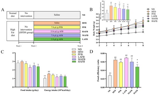 Effect of AFB on body weight, food intake, and food efficiency. (A) Schematic diagram of the experiment. (B) Growth curve of body weight from week 2 to week 8. (C) Average food and energy intake from week 2 to week 8. (D) Food efficiency = body weight gain/food intake. The results are expressed as the mean ± SD. * p < 0.05, ** p < 0.01 versus the HFD group and # p < 0.05, ## p < 0.01 versus the ND group by one-way ANOVA.