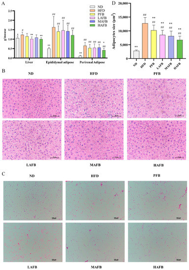 Effect of AFB on tissue. (A) Weight of the liver, epididymal adipose, and perirenal adipose tissue. (B) H&E staining of the liver (400×). (C) H&E staining of epididymal adipose tissue (100×). (D) The size of the epididymal adipose tissue. The results are expressed as the mean ± SD. * p < 0.05, ** p < 0.01 versus the HFD group and # p < 0.05, ## p < 0.01 versus the ND group by one-way ANOVA.