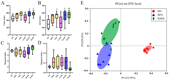 AFB affected the α and β diversity of the mouse gut microbiota. (A) Chao index, (B) ACE index, (C) Shannon index, (D) Simpson index, and (E) UniFrac distance-based principal coordinate analysis (PCoA) of the ND, HFD, and HAFB groups. # p < 0.05, ## p < 0.01 versus the ND group by one-way ANOVA.