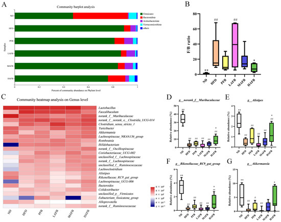 AFB restructured the mouse gut microbiota. (A) Relative abundance of gut microbiota at the phylum level. (B) F/B ratio. (C) Heatmap of the relative abundance of each group at the genus level. (D–G) The relative abundances of some genera were significantly changed due to the consumption of AFB. * p < 0.05, ** p < 0.01 versus the HFD group and # p < 0.05, ## p < 0.01 versus the ND group by one-way ANOVA.