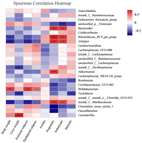 Correlation analysis. The heatmap shows Spearman correlations among the obesity-related parameters and gut microbiota. Spearman correlations among the obesity-related parameters and gut microbiota. Significant correlations are displayed as * p < 0.05, ** p < 0.01.