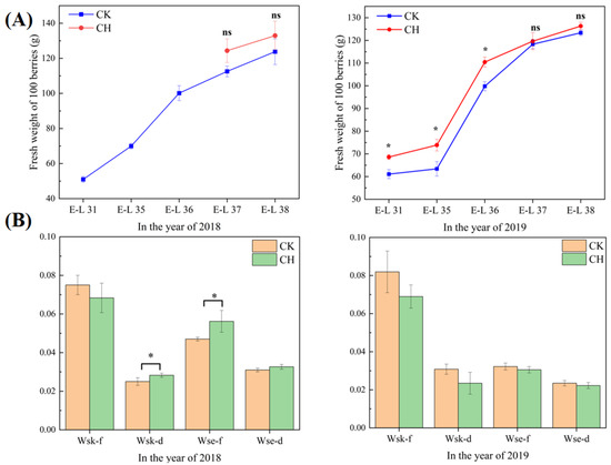 Effects of covering peanuts on berry weight in 2018 and 2019 (A), and skin weight and seed weight in 2018 and 2019 (B). Wsk-f, Skin fresh weight (g/berry); Wsk-d, Skin dry weight (g/berry); Wse-f, Seed fresh weight (g/berry); Wse-d, Seed dry weight (g/berry). Data are expressed as mean ± standard error (n = 3). Different letters with each stage indicate the significant differences based on Duncan’s test at p < 0.05, and ns indicates no significant differences between treatments. CK: clean tillage; CH: covering peanuts.