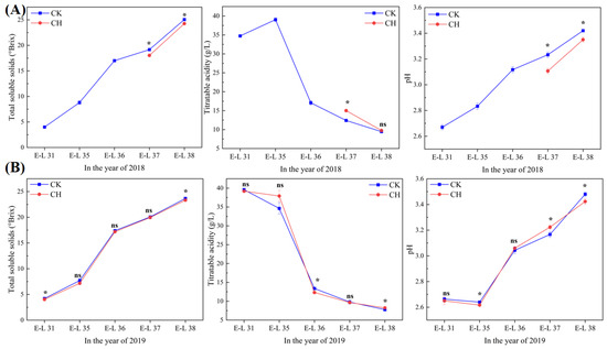 Effects of covering peanuts on the total soluble solids, titratable acidity and pH in 2018 (A), and in 2019 (B). Data are expressed as mean ± standard error (n = 3). Different letters with each stage indicate the significant differences based on Duncan’s test at p < 0.05, and ns indicates no significant differences between treatments. CK: clean tillage; CH: covering peanuts.