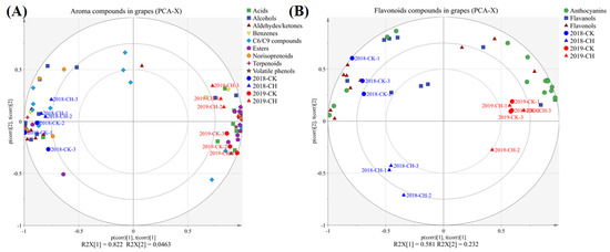 PCA based on aroma and flavonoids compounds concentrations separating grape samples according to vintage and treatment. (A) correlation loading plot in aroma compounds of grape berries, (B) correlation loading plot in flavonoids in grape berries.