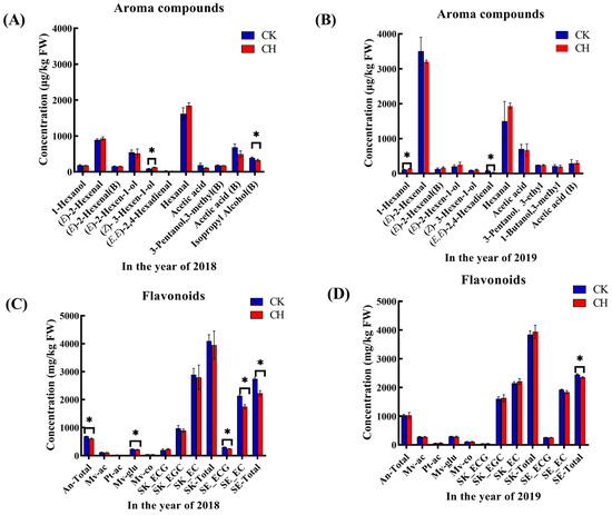 Effects of covering peanuts on the concentrations of the marker aroma compounds and flavonoids in the mature grapes in 2018 and 2019. The marker aroma compounds in 2018 (A) and 2019 (B); marker flavonoids in 2018 (C) and 2019 (D). Data in bar plots are expressed as mean ± standard error (n = 3). * indicates significant differences based on Duncan’s test at p < 0.05.