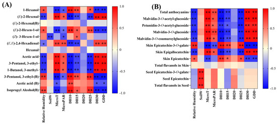 Pearson correlation analysis revealing the relationships between the climate indicators and the marker aroma compounds (A), and the marker flavonoids compounds (B). Different cell colours in the heatmaps represent a positive (red) or negative (blue) correlation. ** represents significant correlations at p < 0.01 and * represents significant correlations at p < 0.05.
