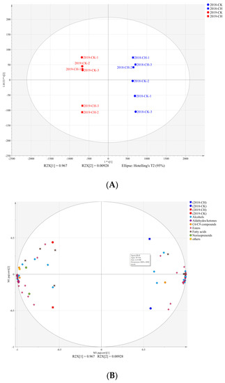 OPLS-DA analysis based on the aroma compounds in the wines of CK and CH in 2018 and 2019. (A) score scatter plot, (B) correlation loading plot.