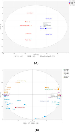 In terms of the result wines, we applied the OPLS-DA analysis to investigate the effects of the treatments and years on the concentrations of the flavonoids [37]. The R2X [1] (R2X [1] = 71.4%) separated the vintages clearly (Figure 7). As shown in Figure 7 and Table S8, compared to 2018, the loading plot showed higher concentrations of the total anthocyanins, flavonols and flavan-3-ols in 2019, which was consistent with grape berries, as described above. R2X [2] explained 24.1% of the total variance and separated the clean tillage and covering peanuts. R2X [2] was positively correlated with all of the flavonols, except for myricetin-3-O-galactoside and myricetin, while it was negatively correlated with anthocyanins (Figure 7B). Notably, concentrations of Kaempferol-3-O-glucoside (Kae-glu), Quercetin-3-O-glucoside (Que-glu), Myricetin-3-O-glucoside (Myr-glu) and the total flavonols were consistently lower by covering peanuts. In addition, the concentrations of procyanidin B1 and Delphinidin-3-O-glucoside (Dp-glu) were consistently higher in the covering peanuts wines than in the CK wines (Table S8).