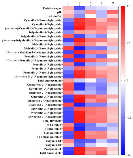 In order to explain the wine colour differences either between the vintages or between the treatments, based on the wines’ colorimetric, the physiochemical parameters and the flavonoids concentrations, we conducted the correlation analysis, and the results are shown in Figure 8. The residual sugar content, pH and alcohols were positively correlated with the L value while negatively correlated with the a* value (Figure 8). This result is inconsistent with those of Wang Yu et al. [37]. Conversely, anthocyanins, including Cyanidin-3-O-acetyl-glucoside (Cy-ac), Cyanidin-3-O-glucoside (Cy-glu), Cyanidin-3-O-coumaroylglucoside (Cy-co), Delphinidin-3-O-glucoside (Dp-glu), Delphinidin-3-O-coumaroylglucoside (Dp-co), Malvidin-3-O-glucoside (Mv-glu), Malvidin-3-O-coumaryl-glucoside (Mv-co), Peonidin-3-O-coumaroylglucoside (Pe-co), Petunidin-3-O-glucoside (Pt-glu), Petunidin-3-O-acetyl-glucoside (Pt-ac), Petunidin-3-O-coumaroylglucoside (Pt-co), flavonols including Quercetin-3-O-glucoside (Que-glu), Quercetin-3-O-glucuronide (Que-gluc), Myricetin-3-O-glucoside (Myr-glu), Syringetin-3-O-glucoside (Syr-glu), Syringetin-3-O-galactoside (Syr-gal), and flavan-3-ols including Gallocatechin (GC), (-)-Epigallocatechin (EGC) and Procyanin C1 were negatively correlated with L*, while positively correlated with a*, b* C* (Figure 8).
