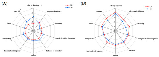 Effects of covering peanuts on the sensory evaluation of ‘Cabernet Sauvignon’ wines. (A) the wines of 2018; (B) the wines of 2019. * indicates significant differences between the control and covering purslane (p < 0.05, t-test).