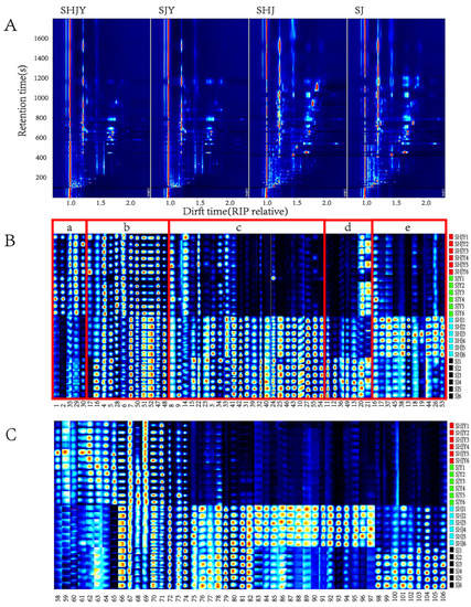 (A): topographic of SHJ, SJ, SHJY, SJY detected by HS-GC-IMS; (B,C): gallery plot of SHJ, SJ, SHJY, SJY detected by HS-GC-IMS. The a, b, c, d, and e are significant components of ZBL, ZBP and ZBL, ZBP, SHJ and SJ, respectively, among the identified components. (The codes of the compounds correspond to those in Table 1.)