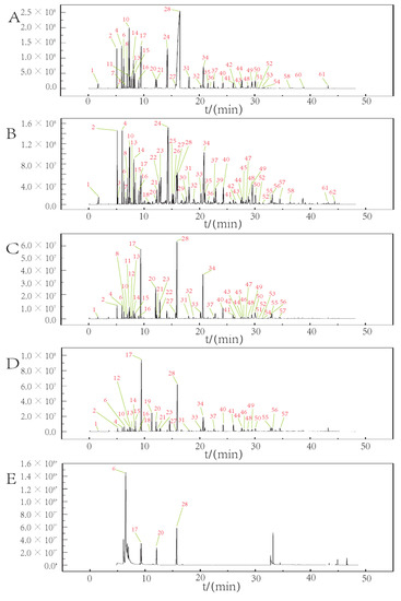 GC-MS total ion chromatogram ((A–E) corresponded to SJ, SHJ, SHJY, SJY, Reference compounds).