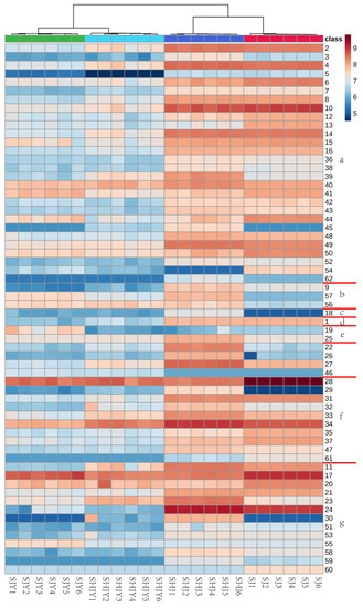 Heatmap of cluster analysis of content detected by HS-SPME-GC-MS. The a, b, c, d, e, f and g correspond to alkene, other, phenol, acid, aldehyde, ketone, ester and alcohol, respectively (the codes of the compounds correspond to those in Supplementary Table S3).