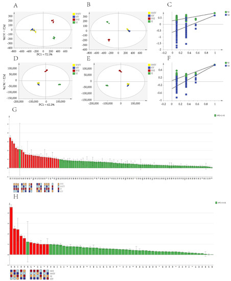 PCA, OPLS-DA, Permutation and VIP of HS-SPME-GC-MS correspond to (A–C,G); PCA, OPLS-DA, Permutation and VIP of HS-GC-IMS correspond to (D–F,H). (The codes of the compounds correspond to those in Supplementary Table S3).