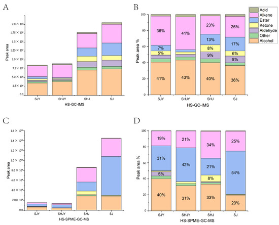 Percentage of component content of SHJ, SJ, SHJY, SJY. (A,B): the absolute and percentage contents of HS-GC-IMS; (C,D): the absolute and percentage contents of HS-SPME-GC-MS.
