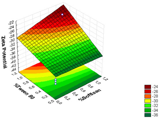 Surface response chart of (A) the effect of the % of Tween® 80 and SOFTISAN® 649 on ZP.