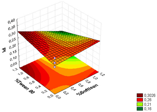 Surface response chart of the effect of the % of Tween® 80 and SOFTISAN® 649 on PI.