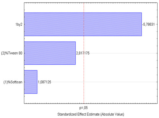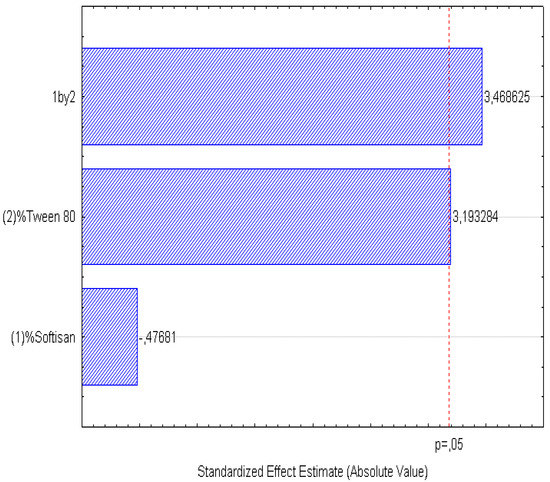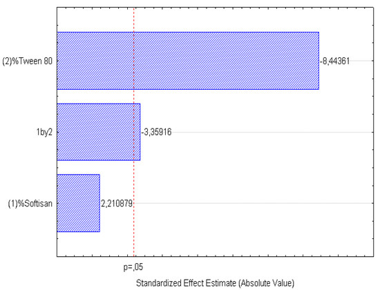 In the surface response graphs (Figure 1, Figure 2 and Figure 3) and in the Pareto diagram obtained for each dependent variable (Figure 4, Figure 5 and Figure 6), the significant influence of the interaction of the concentration of SOFTISAN® 649 (X1) and that of Tween® 80 (X2) on the three dependent variables (p < 0.05) is shown. In the case of PI and particle size, a negative effect of the interaction of the two factors was observed, meaning that there was an inverse proportional relationship between them. In fact, an increase in the percentages of X1 and X2 led to a smaller particle size and PI. Furthermore, Tween® 80 had a significant influence on the particle size, being proportionally inverse. However, in the case of the zeta potential, a direct proportional relationship was observed, in which an increase in the two factors also increased this dependent variable.