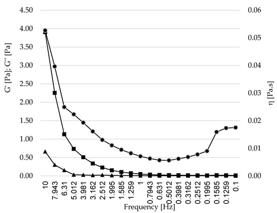 An important part in the design and production of LNs is the behavior after in vivo administration or after inclusion in food matrices. This behavior can be predicted by studying the rheological properties of the formulation. Rheological features have a strong impact on physical and sensory characteristics of food systems [48,49]. Figure 7 shows the flow curves of the oscillation frequency sweep test of the aqueous LN dispersion at room temperature. The storage modulus G′ (viscous component), the loss modulus G″ (elastic component), and complex viscosity (η) are presented.