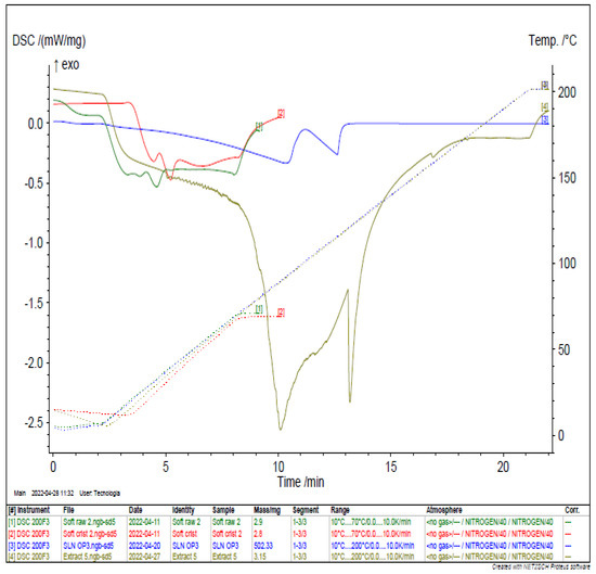 DSC analysis of the optimal LN (blue), N. gaditana extract (gray), raw SOFTISAN® 649 (green), and crystallized SOFTISAN® 649 (red).