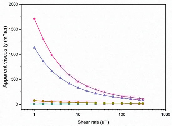 Apparent viscosity of the 50%-75 °C (green square), 50%-100 °C (orange circle), 60%-75 °C (purple triangle), and 60%-100 °C (pink star) IMF feed emulsions versus shear rate (1–300 s−1).